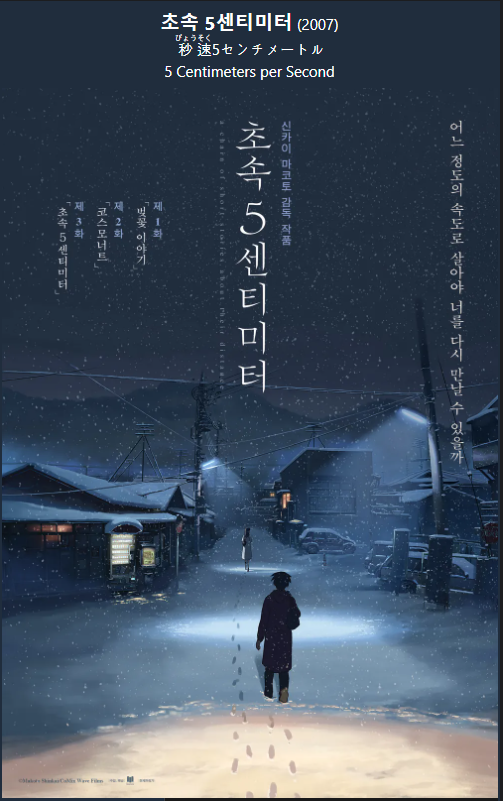 초속 5센티미터는 본질적으로 사랑과 이별의 달콤하면서도 씁쓸한 본질에 대한 깊이 있는 인간 이야기입니다.